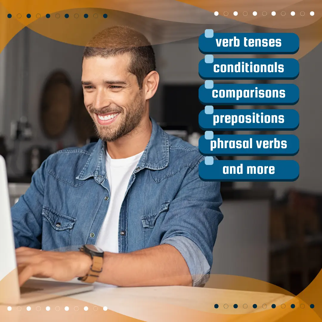 Regularly updated self-study course covering English Grammar for work, including tenses review, prepositions, phrasal verbs, and more.